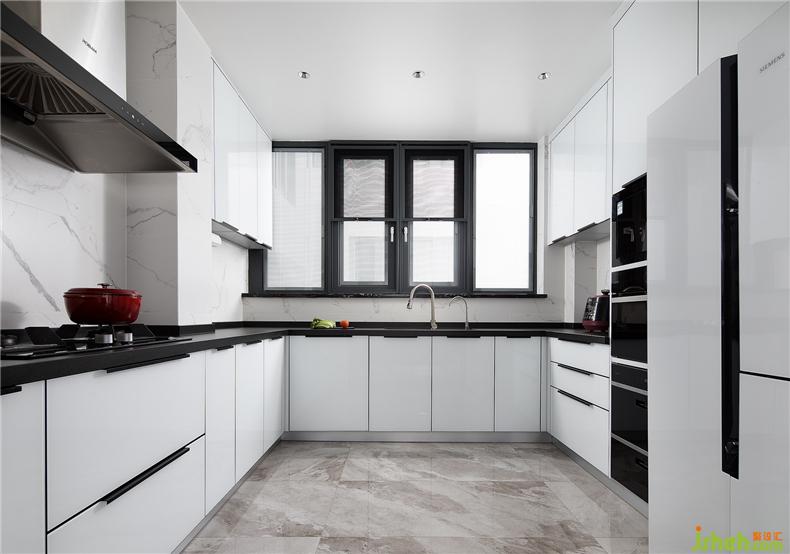 白色烤漆板的櫥柜與黑色的臺(tái)面結(jié)合,