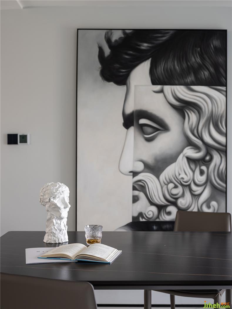 這樣的意蘊(yùn)一直從客廳到廚房,順著視野及功能層次延續(xù)著到餐廳。只是相較于另一邊的精致細(xì)膩,巨大的現(xiàn)代抽象畫作以一種力量型的雕塑美,填充著空間