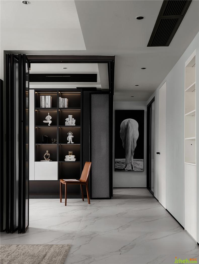 思想連續(xù)到書房,玻璃折疊門一方面引入自然光源,一方面擴(kuò)寬過(guò)道,必要時(shí)還可以關(guān)上,保證隱私且安靜自在