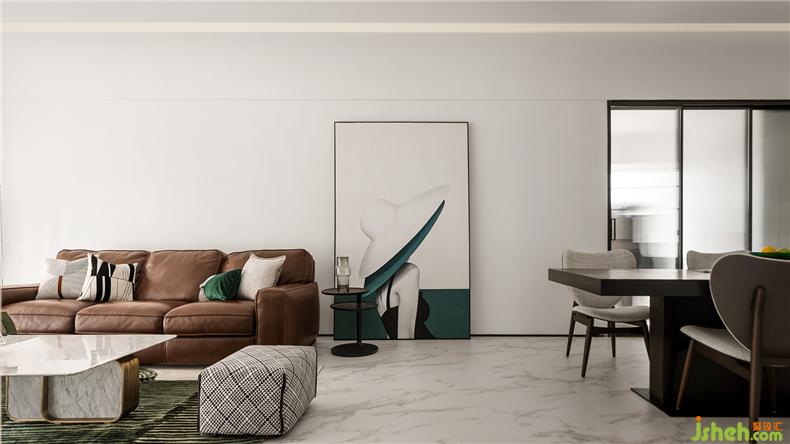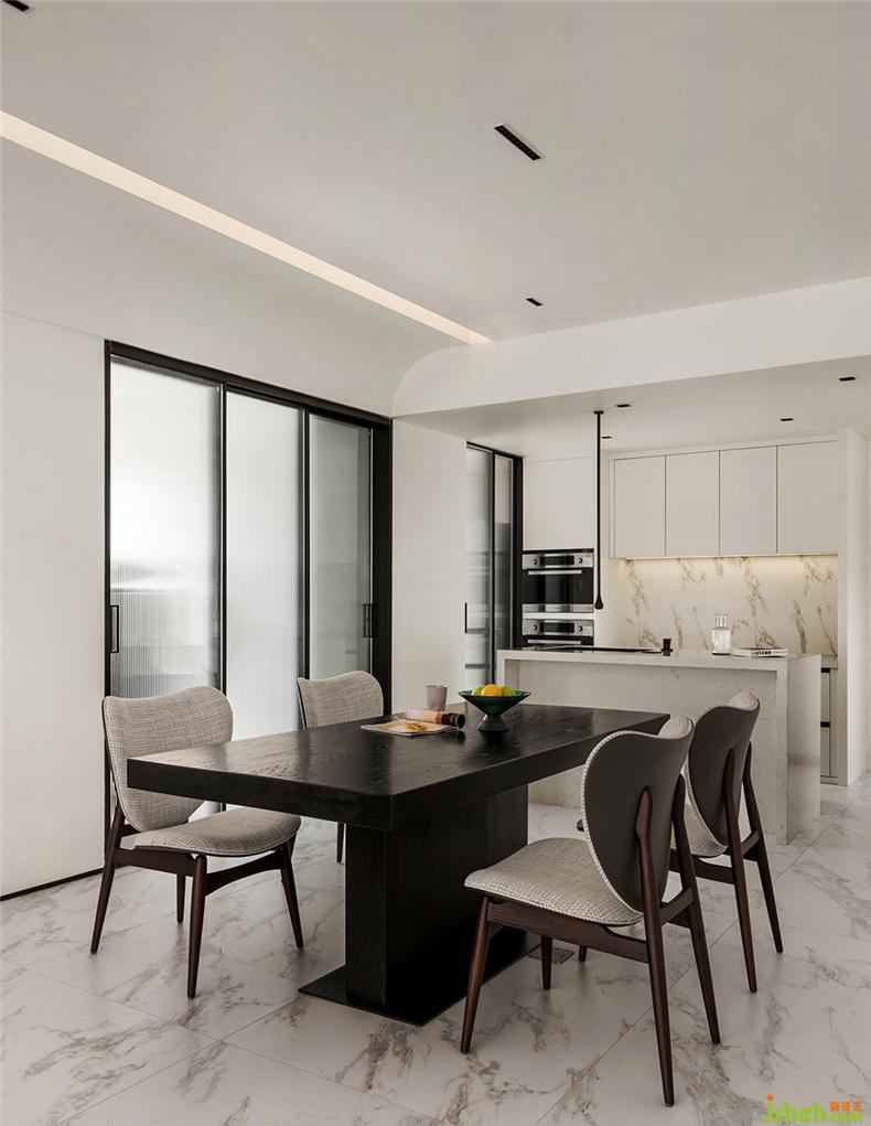 客廳、餐廳、西廚島臺(tái)三區(qū)一體,強(qiáng)化主空間的功能使用,室內(nèi)設(shè)計(jì)師而且視野開(kāi)闊、格局疏朗,兼容藝術(shù)與生活;