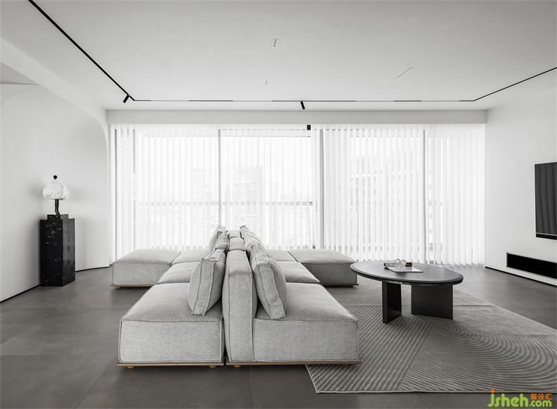 客廳、餐廳、廚房、書房,完全開放;三張簡單的桌子、一套舒適的沙發(fā)、室內(nèi)設(shè)計師幾筆弧線、一系灰色,奠定空間的純粹,無需彰示什么,生活就在那里,以腳步起點,光為色彩,隨心所動,繪出身體與精神上需要的所有。