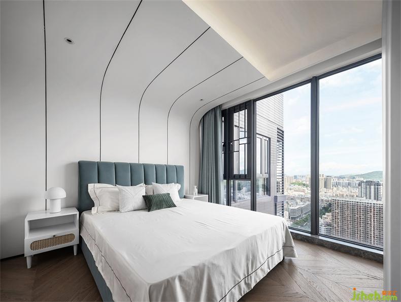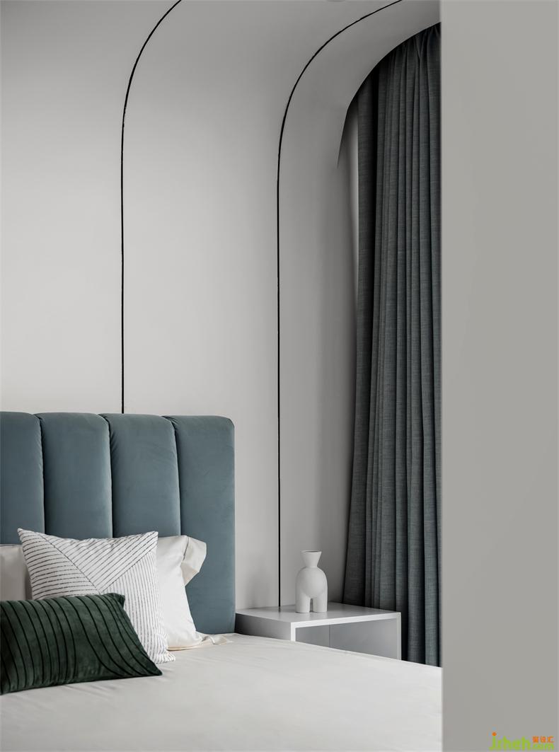白色主調(diào)的簡(jiǎn)約依然是空間狀態(tài),但內(nèi)容也更加豐盈了,室內(nèi)設(shè)計(jì)師線條的連續(xù)性,勾勒優(yōu)雅,借由藍(lán)色、綠色,讓窗外與室內(nèi)自然交融,呈現(xiàn)次臥的舒適溫馨。