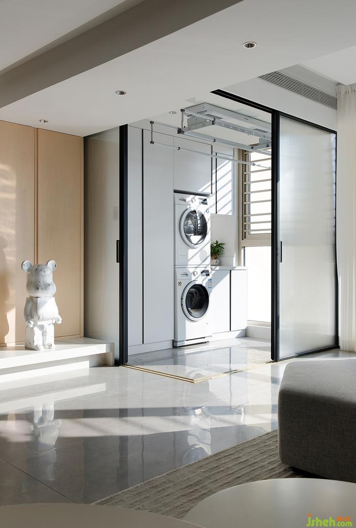 我們把陽臺分為兩個功能來使用,一是滿足家人需洗衣與晾曬的功能,二是家人的喝茶區(qū)域。深圳家裝設(shè)計在這個家里洗衣房的區(qū)域,我們用可開可合的長虹玻璃來與客廳做一個隔斷,平時晾曬衣物的時候關(guān)上玻璃門,也不會顯得客廳空間凌亂。