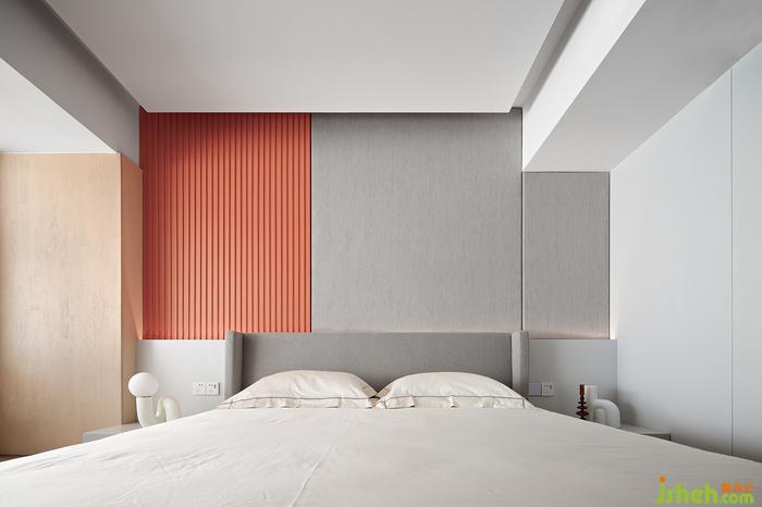 灰與白的空間加入一抹橙色,讓臥室不沉悶;床頭背景墻做了上下分段并暗藏燈帶,天花也做了懸浮吊頂和暗藏燈帶。