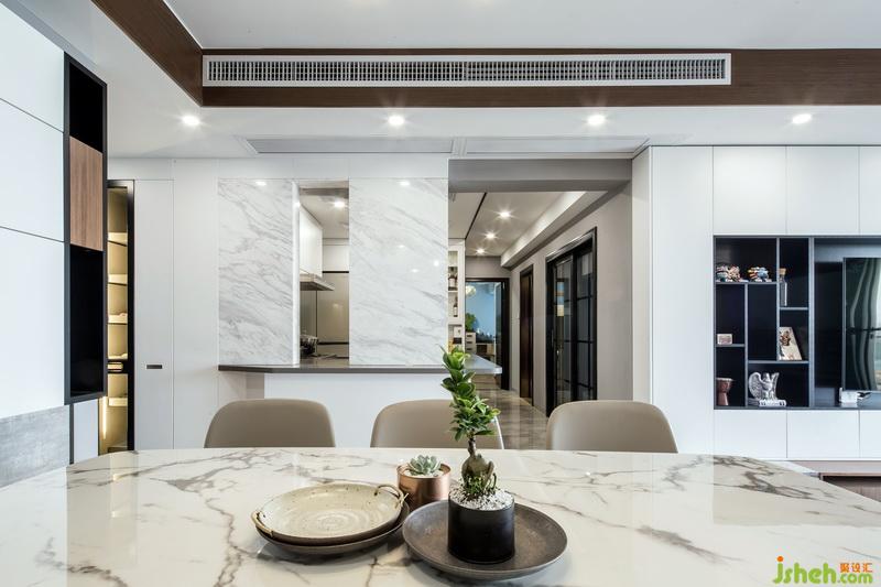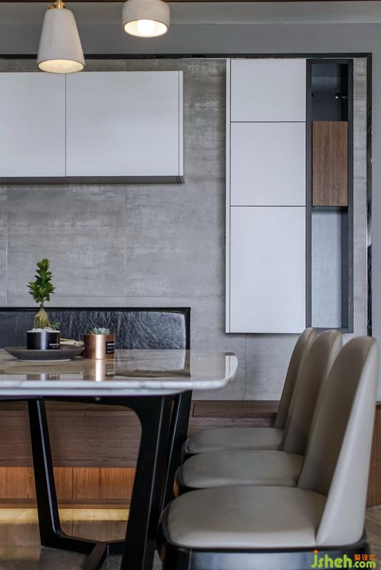 考慮到偶爾會(huì)大家庭聚會(huì),所以在餐廳的設(shè)計(jì),我采用的是組裝柜體卡座,餐廳是一個(gè),你給它很多細(xì)節(jié)它就會(huì)還你更多功能的地方,卡座采用柜體結(jié)構(gòu),可以儲(chǔ)物和儲(chǔ)存小孩玩具,平時(shí)可以當(dāng)作小孩玩具娛樂區(qū),卡座的延伸與玄關(guān)的換鞋椅成為一體,同時(shí)與半開放式廚房臺(tái)面形成一個(gè)新的動(dòng)線方向,避免了入戶門直接對(duì)沖陽臺(tái)推拉門的風(fēng)水問題,也增加了廚房的實(shí)用功能,櫥柜斜形臺(tái)面,主要提供放置業(yè)主的隨手物件,例如鑰匙,錢包,臺(tái)面上的兩面墻體,一是具有裝飾性,同時(shí)也能很好的遮擋日后廚房使用起來的一個(gè)凌亂現(xiàn)場(chǎng),中間的留空,可提供女主人與客廳家庭成員的一個(gè)溝通,也能起到傳菜的功能。