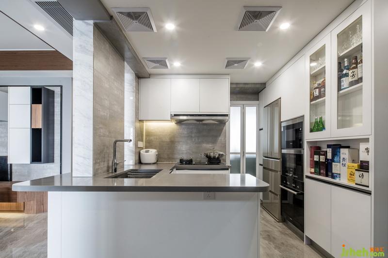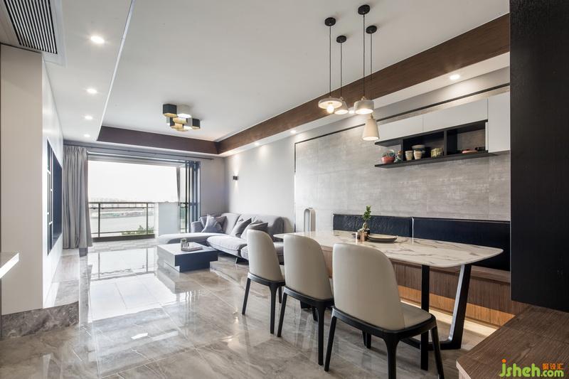 在空間立面設(shè)計(jì)上,造型做到一減再減的設(shè)計(jì)手法,讓空間變大,家具盡量使用實(shí)木家具以保證綠色環(huán)保,電視墻面是滿墻的柜體,卻并沒有造成視覺的擁堵,因?yàn)榕c櫥柜的臺(tái)面處理成同一面,巧妙的弱化了存在感,色彩上采用大面積色塊,灰色配合了高質(zhì)感的家具材質(zhì),燈光使用暖黃光,符合業(yè)主的品味也不失一家四口的和諧溫馨。