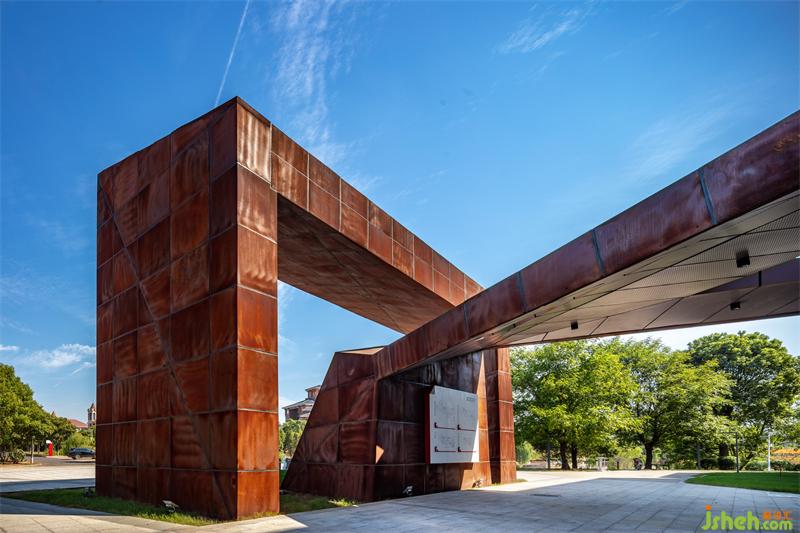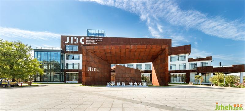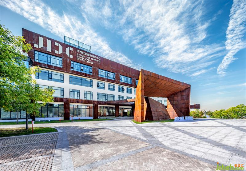JIDC整體建筑以“簡約工業(yè)風”為主,符合國際化、現(xiàn)代化的設計理念,以創(chuàng)新、開拓、發(fā)展、不復古的手法改造。細節(jié)處保留原始建筑風格翻新,采用沉穩(wěn)簡約的建筑造型、磚紅色的工業(yè)風外墻、開放式的外圍設計。中心建筑外部以紅、白兩色為主色調(diào),做舊的紅色鐵皮外墻包裹著建筑四面,內(nèi)部以灰、白為主色調(diào),盡顯高端氣質(zhì)。整體建筑用不同角度的方形體塊相互穿插組成,以鋼板、玻璃、白色外墻漆為立面主要材料。