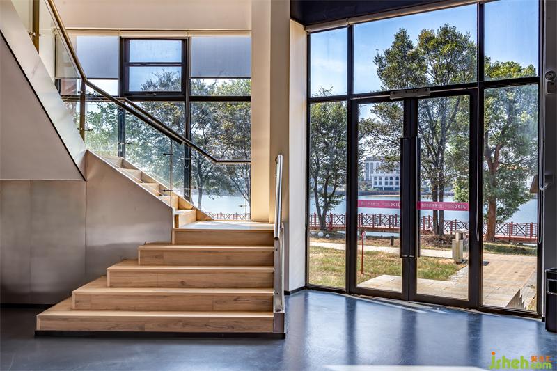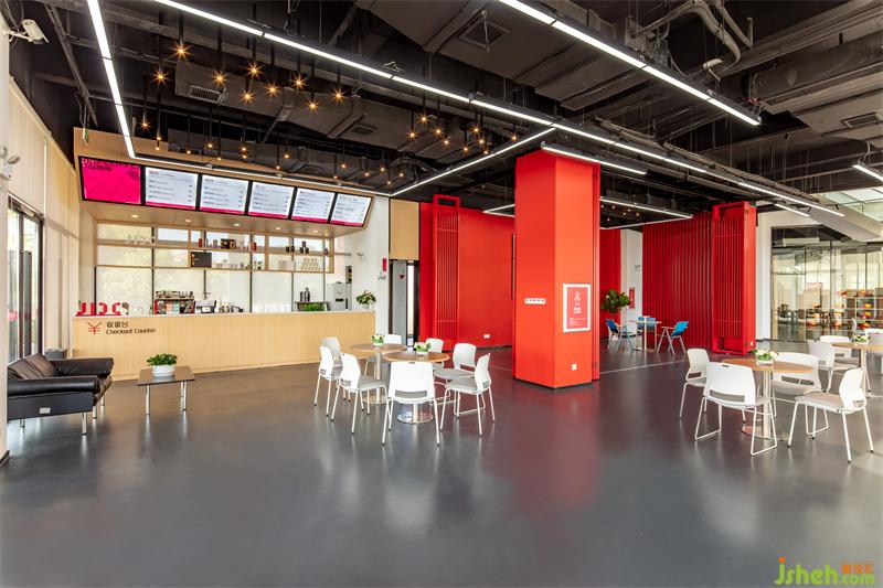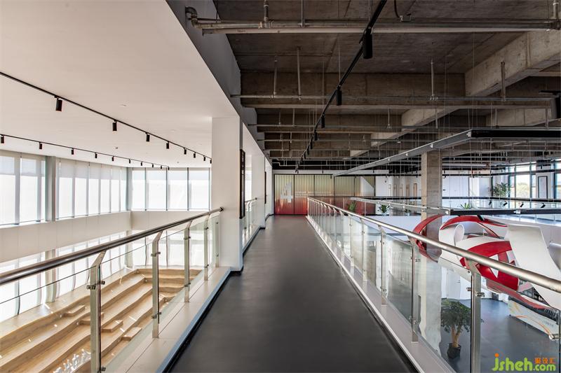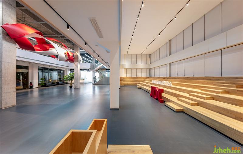 穿過展廳,空間重新置入創(chuàng)意社區(qū)及共享辦公的功能,對場地進行相應(yīng)設(shè)計,辦公室設(shè)計以激發(fā)場地的空間潛力,賦予它作為城市創(chuàng)意社區(qū)的新生。現(xiàn)代主義意蘊的紅白相間吊空裝置,凝固了最有張力的瞬間,提升了整個創(chuàng)意社區(qū)的藝術(shù)趣味。