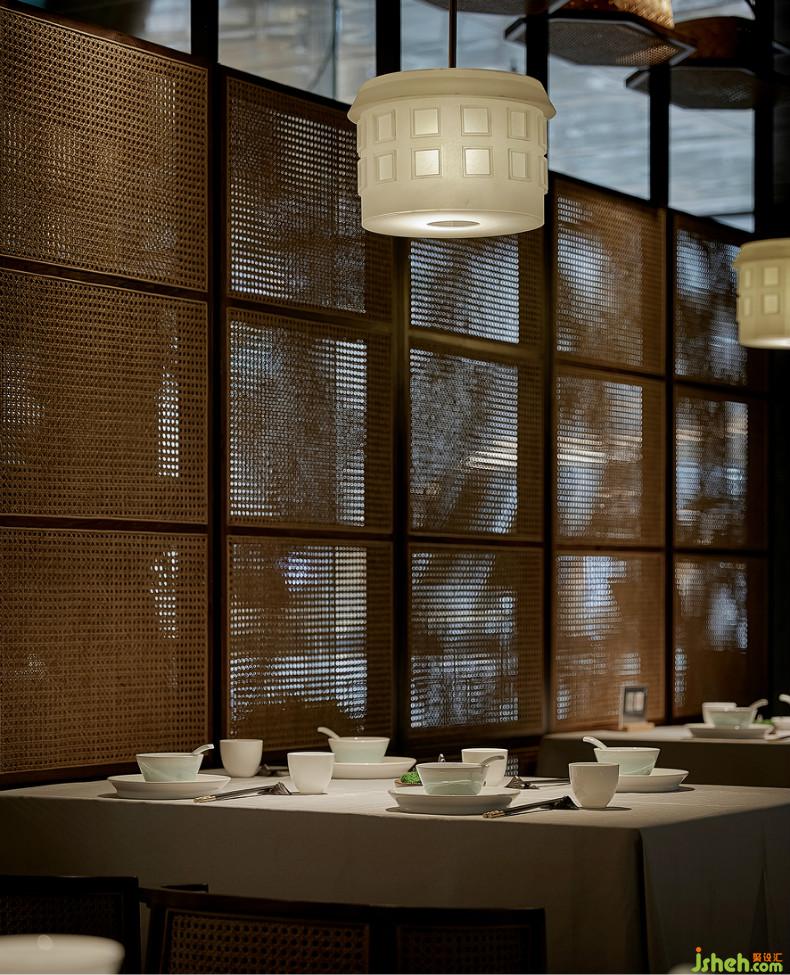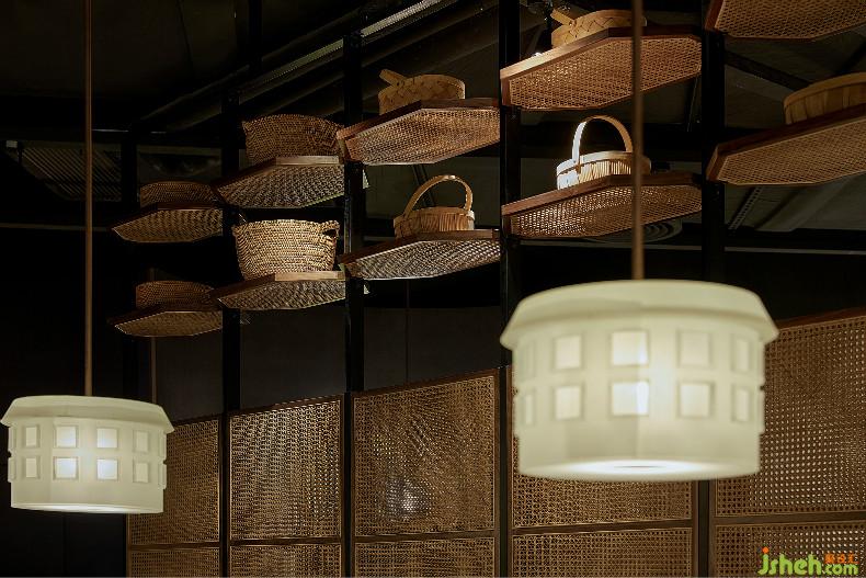 有山設(shè)計還創(chuàng)意性地將客家藤編工藝元素運用于餐廳隔斷,空間網(wǎng)格藤編屏風(fēng)輕巧切割,室內(nèi)燈光通過屏風(fēng)網(wǎng)眼流動,影影綽綽間,私欲交談聲,顧客走動的身影都能讓人感受到生活的氣息。從經(jīng)緯縫隙中透出點點光亮,渲染出溫馨的就餐氛圍和難得人情味。