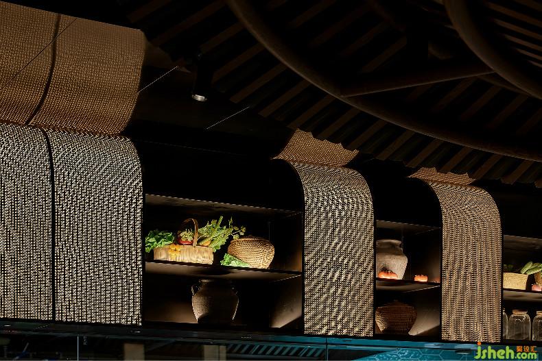 傳統(tǒng)手工藝制品是民間智慧和生活溫度的結(jié)晶。來自山中的藤類植物,經(jīng)由粗糙卻靈巧的雙手,成為隨處可見精美的盛具器皿。網(wǎng)格藤椅、卡座后方的藤編裝飾、明檔上方的藤編弧形隔板,傳統(tǒng)工藝品與現(xiàn)代設(shè)計材料結(jié)合混搭,得到重生。餐廳設(shè)計呼應(yīng)“遷移”和“融合”的客家文化主題。