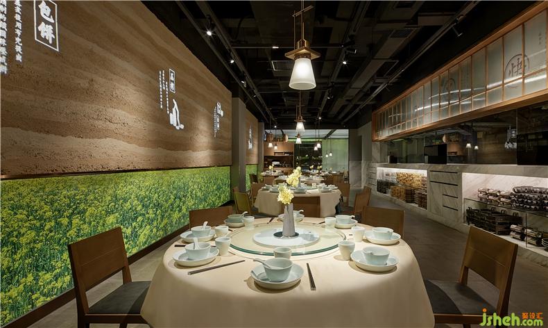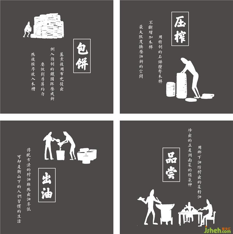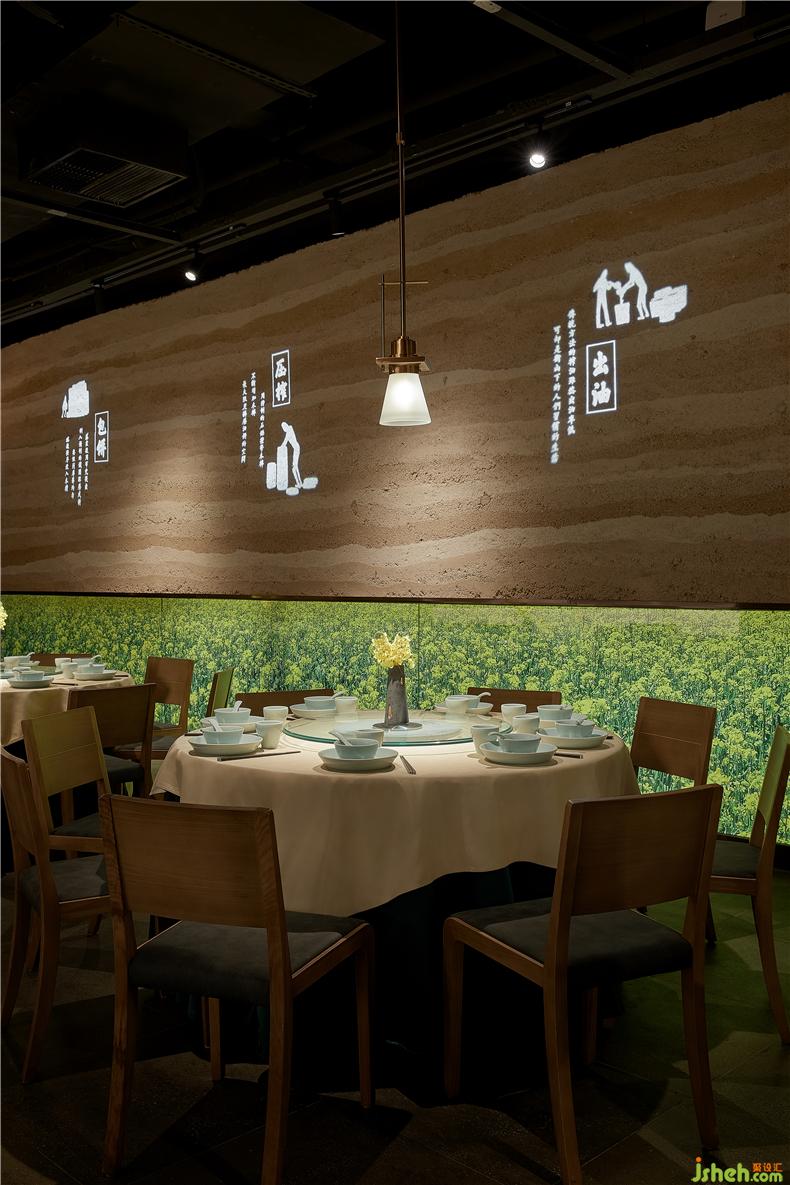 而為凸顯好油炒好菜,菜籽油的古法手工制作流程也被設計師用巖畫的手法加以呈現(xiàn),餐廳設計并通過投影形式映射在空間夯土墻上。夯土,這是油菜種植的土壤,是砌墻的土,亦是隱匿地道湖南味的沃土。