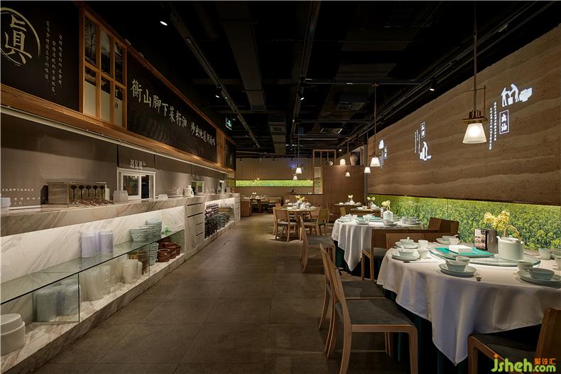 餐廳夯土墻上的投影重現(xiàn)衡山鄉(xiāng)下的榨油場景,與背景墻、食材介紹相映成趣。餐廳設計