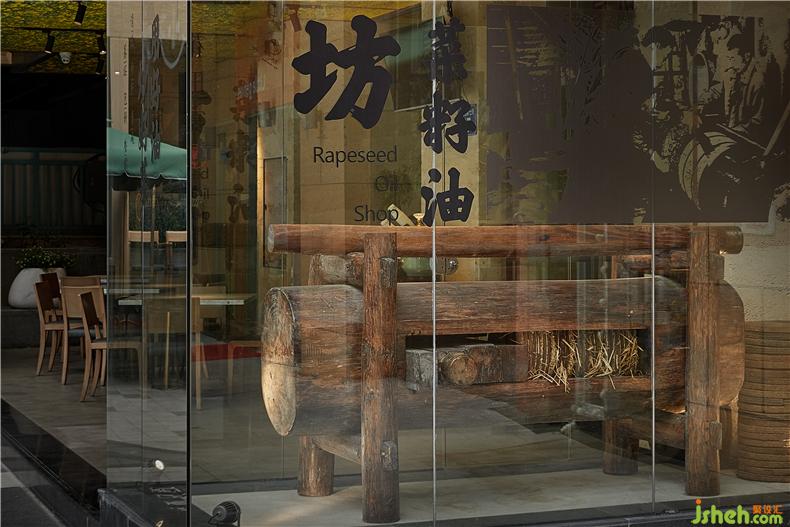 初至「遇見湘」祈福店,一片金燦燦的油菜花海充滿眼簾并延伸室內,門前花海下放置著一具手工木質古法榨油機,兩側整齊地堆疊著菜籽油餅,吸睛的同時力圖傳遞出匠心、傳承的理念,餐廳設計也通過這兩個代表性的符號傳遞出定位的訴求:衡山腳下菜籽油,炒出地道湖南味。