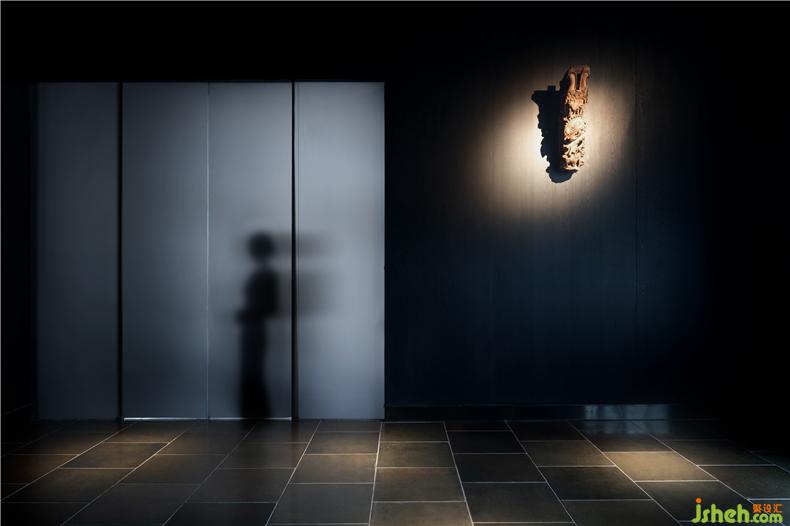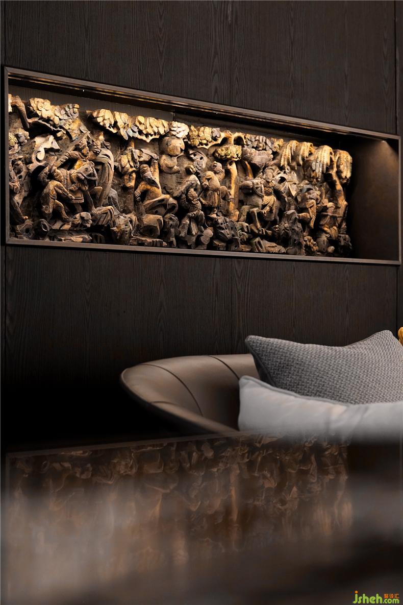 如何將徽雕珍品融于現(xiàn)代藝術(shù)設(shè)計(jì)空間中,巧妙并置,頗為考驗(yàn)設(shè)計(jì)功力。設(shè)計(jì)師擇取御窯金磚、夾絲玻璃、葡萄牙大理石、韓國(guó)木紋鋁板等現(xiàn)代材質(zhì)進(jìn)行諸多探索與嘗試,平衡略顯深沉的空間基調(diào),營(yíng)造相得益彰的視餐廳設(shè)計(jì)覺(jué)呈現(xiàn)。