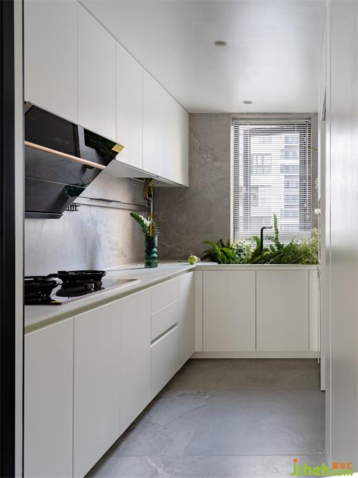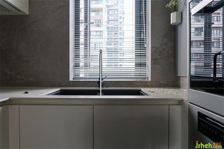 廚房墻地磚使用同款灰色瓷磚,巖板臺(tái)面沒(méi)加厚,海境界家裝設(shè)計(jì)而且沒(méi)有用擋水邊,視覺(jué)效果更簡(jiǎn)潔干凈。