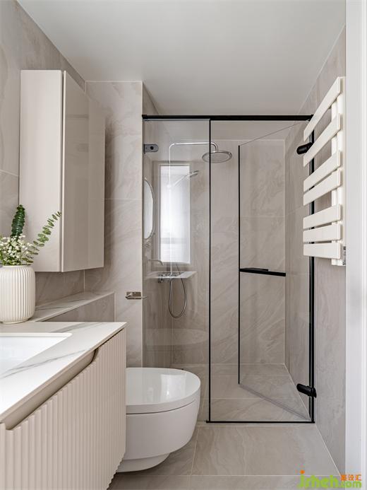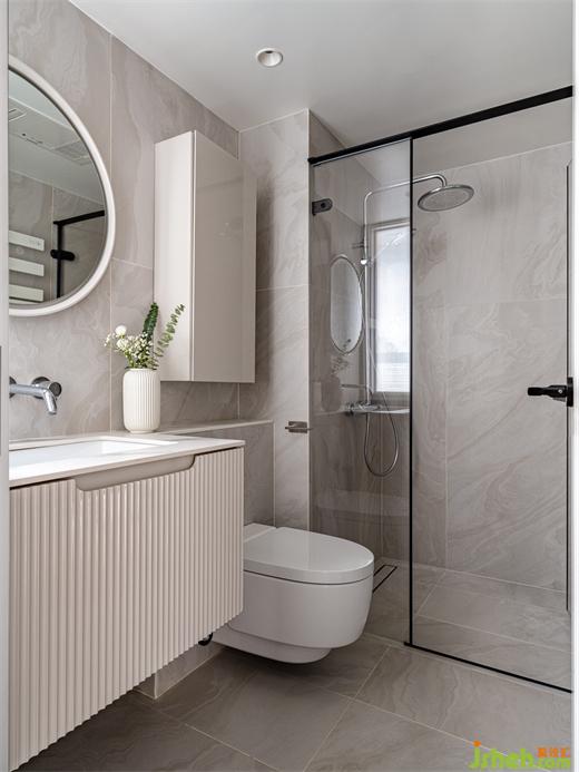 淋浴區(qū)采用下沉式設(shè)計(jì),取消擋水石,整體感更干凈舒適