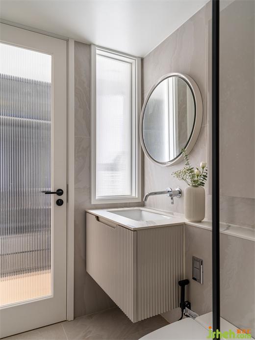 衛(wèi)生間結(jié)構(gòu)調(diào)整后,原窗戶在衣帽間里,為了增加采光在衛(wèi)生間門邊設(shè)計(jì)了一個(gè)內(nèi)窗,與衛(wèi)生間門呼應(yīng)