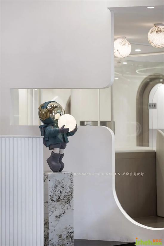 藍(lán)色星球,金色星球,白色球燈,高低錯(cuò)落擺放,宇航員陳設(shè)擺件,火箭元素設(shè)計(jì),前廳穿插連接一樓的多功能游玩區(qū),托育中心設(shè)計(jì)讓整個(gè)空間充滿童趣和探索的興趣。