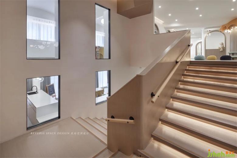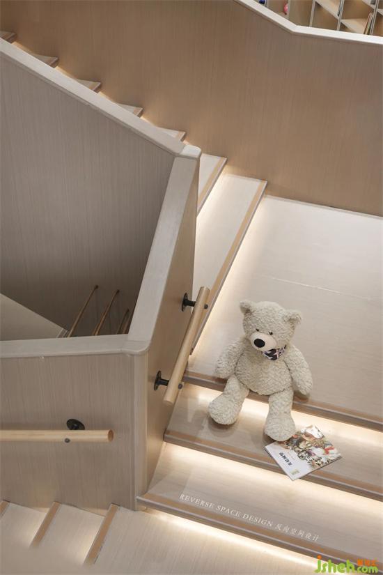 The staircase not only connects the upstairs space, but also serves as a reading and communication area for children.