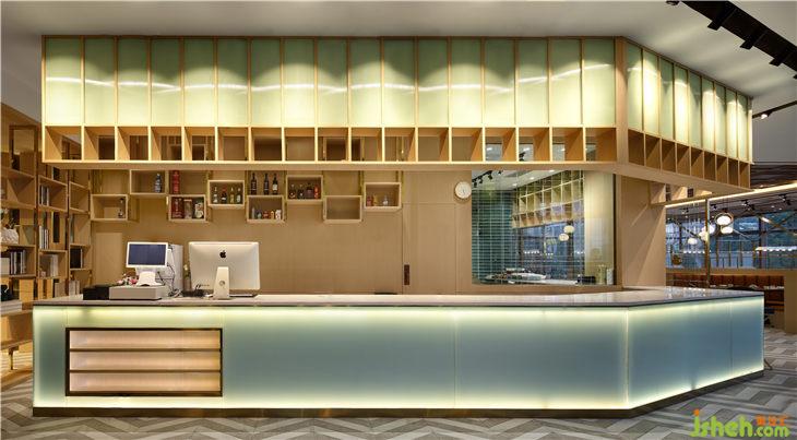 吧臺(tái)區(qū)域+吧臺(tái)區(qū)通過(guò)色彩的組合,冷暖對(duì)比強(qiáng)調(diào)服務(wù)功能區(qū)位的劃分