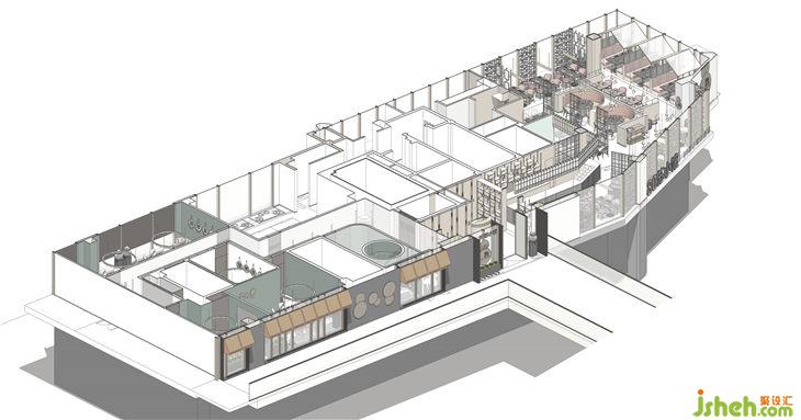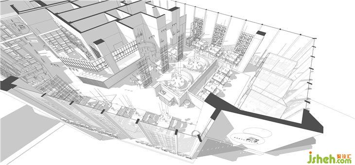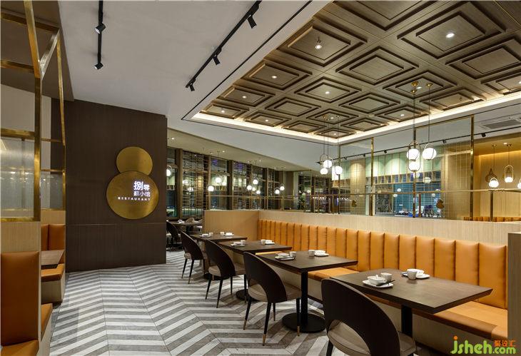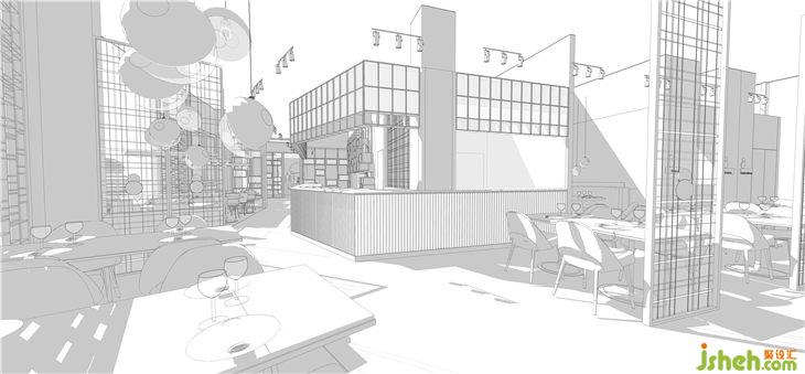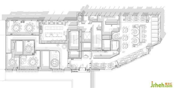原圖建筑中間的核心筒處在整個餐廳最核心的中間位置。很尷尬的把空間均分為二。布局上利用廚房和吧臺吧畸形的角落空間利用起來?;銥檎R园膳_為紐帶,把廚房和就餐區(qū)的功能分開,把服務(wù)聯(lián)系在一起。