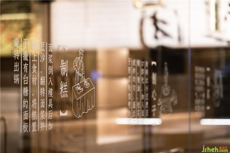 黃天源作為2009年江蘇省首批“非物質(zhì)文化遺產(chǎn)”傳統(tǒng)糕團(tuán)制作技藝的品牌,理應(yīng)在其空間場域來傳承其制糕工藝?!胺沁z展示區(qū)”的玻璃面上,一道道制糕工藝,躍然于空間,讓其看不見的工藝得以重現(xiàn)傳承。