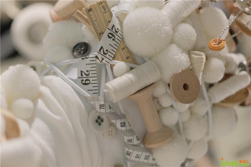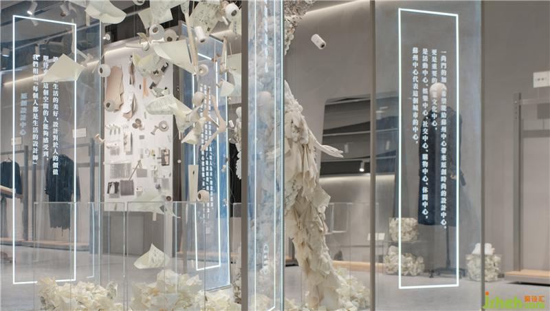 在入口處的藝術(shù)裝置中,我們將卷尺、針線、剪刀、紙樣等做衣服的道具融入其中,重塑工作室場(chǎng)景傳達(dá)設(shè)計(jì)美學(xué)。身上堆滿零件的人偶,走出堆滿廢棄設(shè)計(jì)圖紙,頭頂漫天飛舞的靈感設(shè)計(jì)手稿,是服裝設(shè)計(jì)師嘗試打破層層壁壘,努力邁出的通往時(shí)尚之門的剪影。是他們?cè)诮?jīng)歷了思維的撞擊、融合后,蘇州店鋪設(shè)計(jì)以不同以往的思維方式建構(gòu)自我風(fēng)格的全過(guò)程。