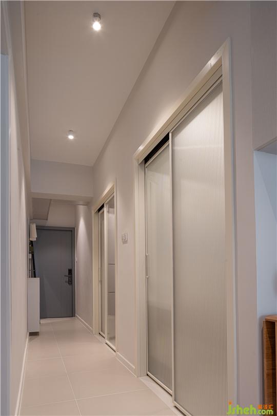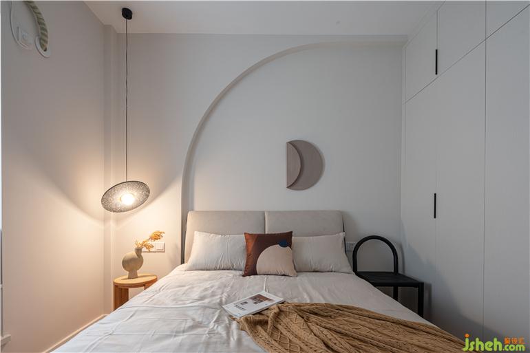 全屋都用了奶咖色的墻漆,通過(guò)暖光的營(yíng)造,整體出來(lái)更溫馨;墻身拱形并非為了做而做,實(shí)際原來(lái)是右側(cè)有一個(gè)凸出來(lái)的柱位,為了將柱隱藏又不影響緊湊的客廳空間面積,廣州舊改設(shè)計(jì)將柱子做成了拱形的對(duì)稱關(guān)系,包括把拱形和各種幾何的元素沿用到各個(gè)空間的軟裝上;客廳陽(yáng)臺(tái)之間使用了折疊落地窗的方法,平常打開(kāi)也可以是客廳的一部分,想晾曬的時(shí)候關(guān)上折疊窗,又可以成為臨時(shí)的生活陽(yáng)臺(tái)。