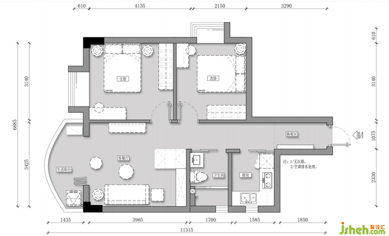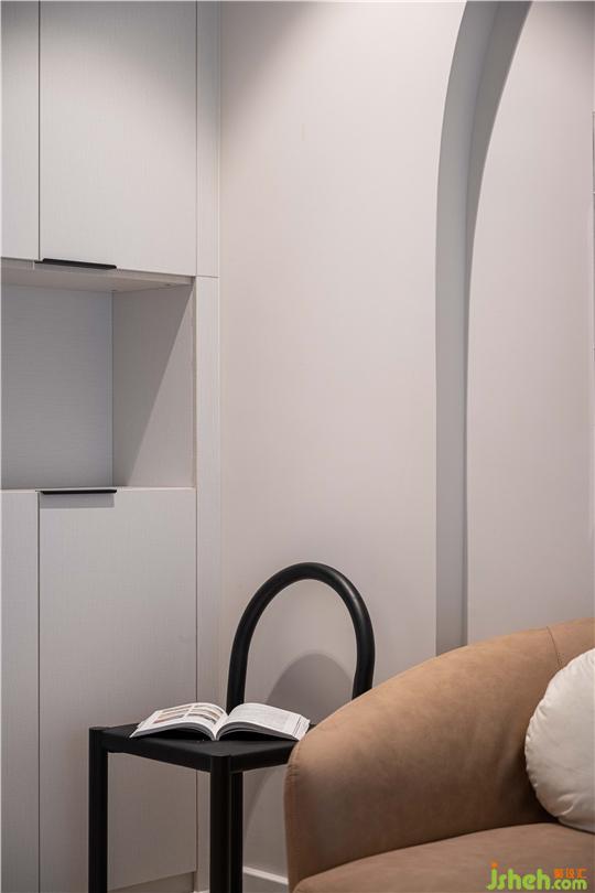 主人房也是跟客廳一樣,有一條梁柱在床的左側(cè),廣州舊改設(shè)計(jì)為了改善這個(gè)問題,我們做了一個(gè)半拱形,既不影響衣柜的位置,也不影響床的尺寸。再結(jié)合半圓的油畫掛飾和橢圓的床頭燈,讓硬裝的形態(tài)和軟裝的元素相呼應(yīng)。