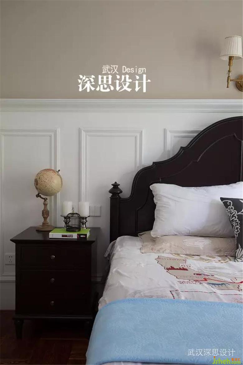 主臥,一張深色的古典美式風(fēng)格雙人床,白色的美式木質(zhì)墻裙,深淺的配色,明快簡(jiǎn)潔又不失沉穩(wěn)大氣,精美的銅燈,呼應(yīng)了空間的品質(zhì)感。