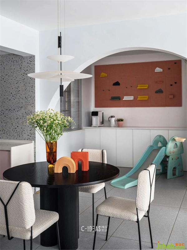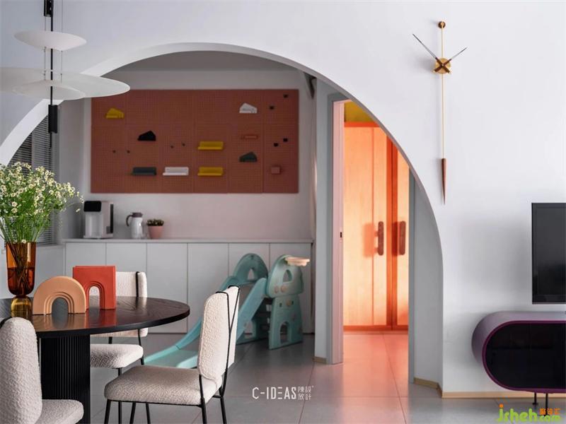 書房去掉一面墻,改成大圓弧洞口,一只可可愛愛的滑梯伸著大象鼻子在洞口里面探頭探腦。墻面洞洞板可以隨意DIY掛件,小書架是家中小寶貝最喜歡的角落。