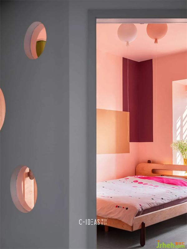 小寶貝的臥室,自然是全屋最粉嫩可愛的處所。書房與兒童房相鄰的墻壁上挖出三個圓圓的月亮窗,既能方便父母照看寶貝,又增添了小小空間的延伸感趣味性。