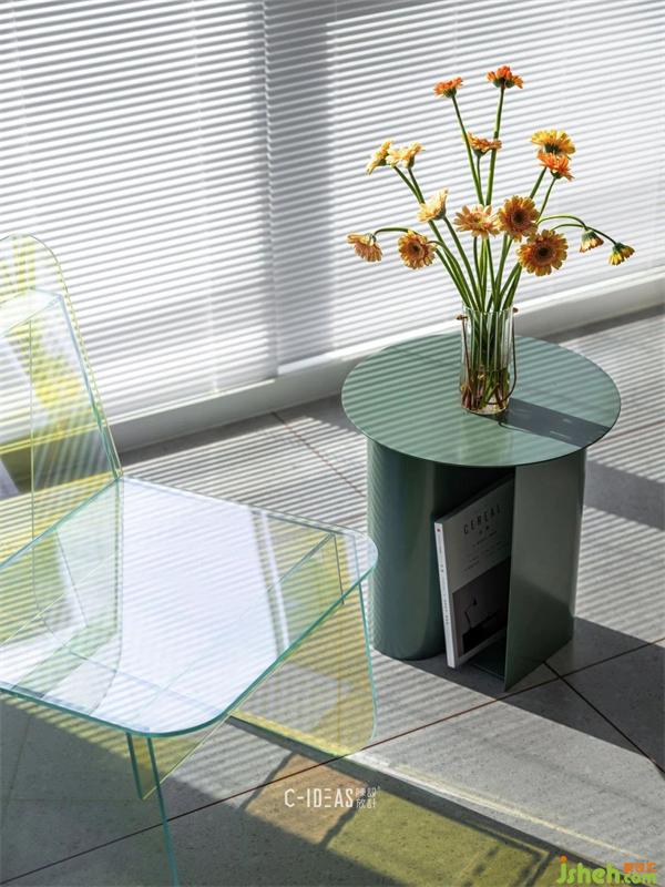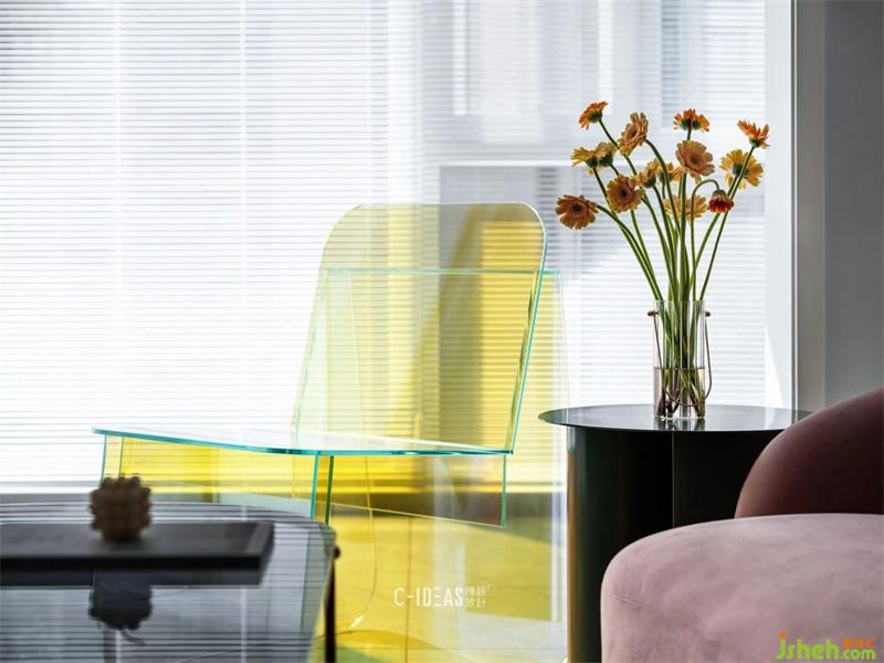 黃色半透明亞克力單椅,灰綠色金屬小茶幾,灰色地磚,粉色勾縫,幾朵非洲菊,滿室陽光。閑適生活,悠哉悠哉。