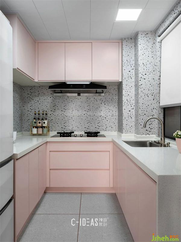 少女心粉色櫥柜+水磨石墻面+白色石英石臺面,整體絢麗甜蜜又溫馨。