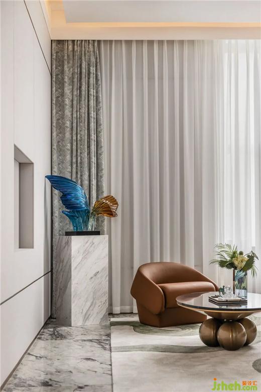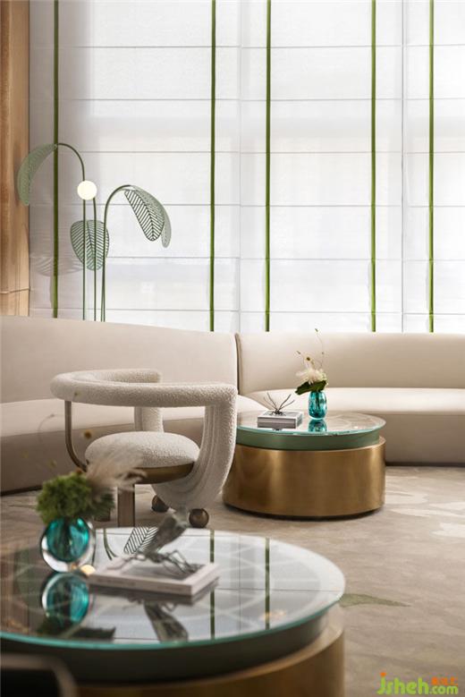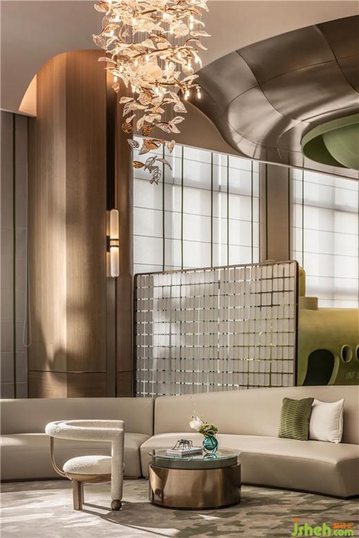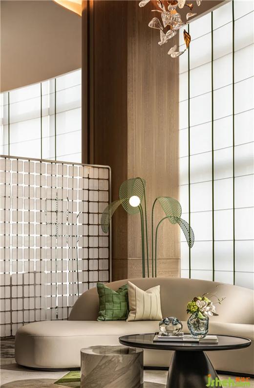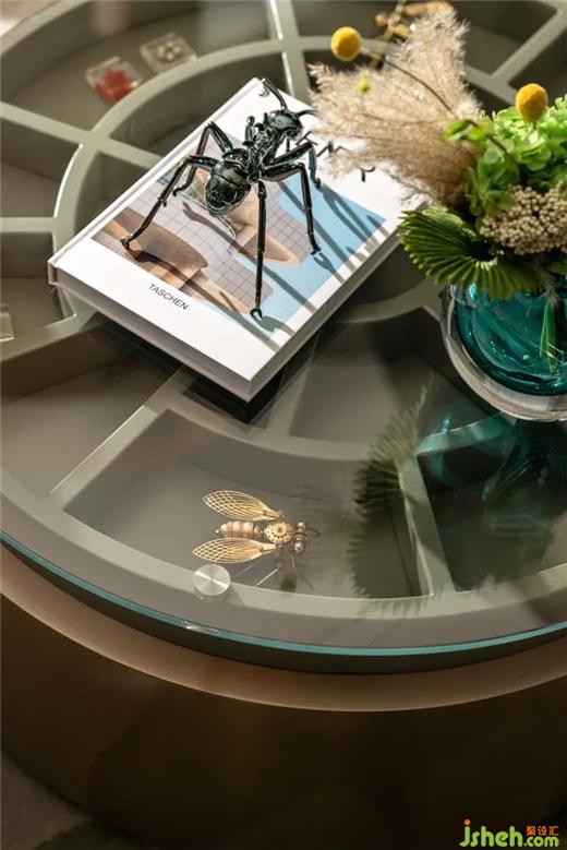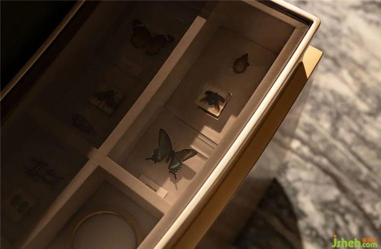 野竹分青靄,樹深時見鹿?;⌒紊嘲l(fā),封藏著各種蟲蝶的茶幾,闡發(fā)著生活的盎然樂趣。城市展廳設(shè)計(jì)以鹿的藝術(shù)裝置映襯,留駐在這城市綠洲,猶如漫步在林間樹下。為空間增添一抹輕快靈動,帶走了城市的陰霾。