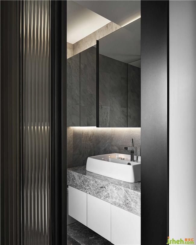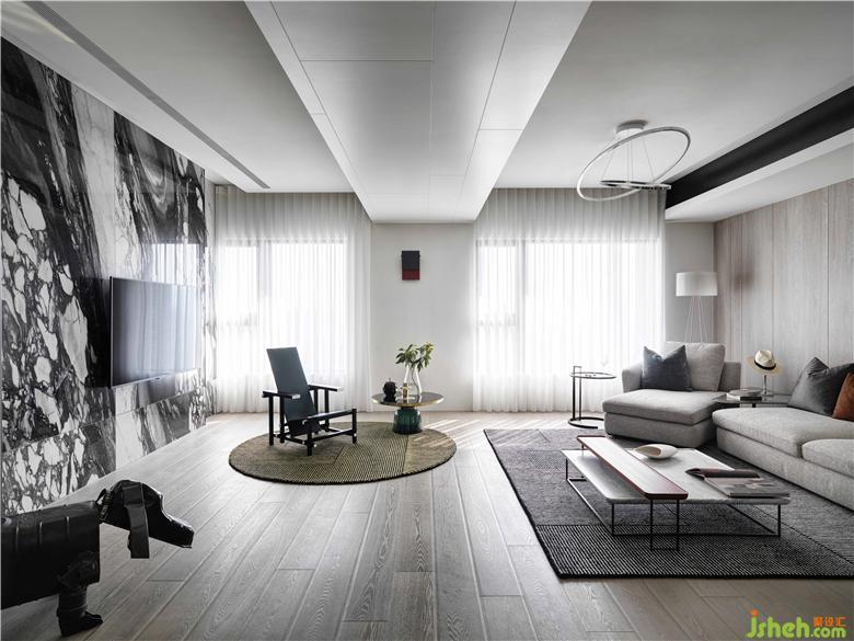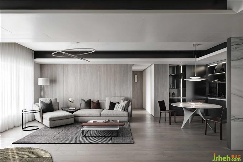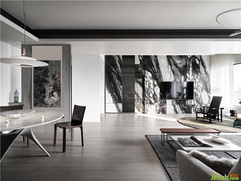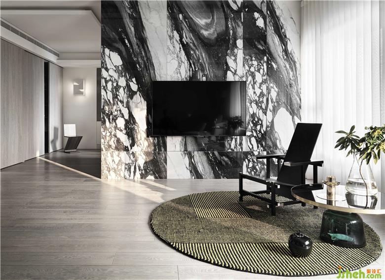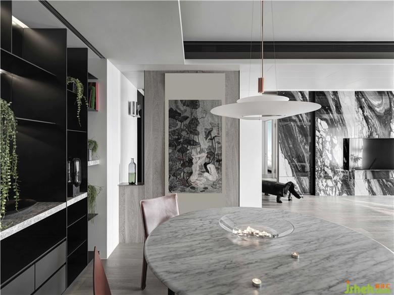 本案位于臺北,為二戶打通的新成屋。美麗的景美溪畔,對于這環(huán)境的喜愛讓屋主買了新家亦是選擇于一溪之隔建案。移除分戶墻將二個(gè)空間合而為一,一方面整合了窗戶,整面大面積開窗讓屋內(nèi)納入大量采光,戶外的風(fēng)景更是一覽無遺。設(shè)計(jì)經(jīng)由層層思考過后,將空間規(guī)劃二端為私領(lǐng)域空間,中間場域則為公領(lǐng)域空間,其目的在于每經(jīng)過一個(gè)空間都可以看到美麗的風(fēng)景,而經(jīng)過每一個(gè)轉(zhuǎn)折處就是質(zhì)感端景。男主人和女主人都喜歡簡潔調(diào)性,因此,在空間的設(shè)定上,以線條、幾何等元素組構(gòu)場域而成,而為了讓空間有重心及豐富的感受,以黑云石串起這視覺焦點(diǎn)。曲線蜿蜒的黑云石面,除了給人流動(dòng)的感受之外,亦和窗外的景美溪相互呼應(yīng),讓遠(yuǎn)方的山景似乎也納入空間場域形成山水意象,使人處于空間之中,如同身處大自然般的舒適愜意。裝修公司