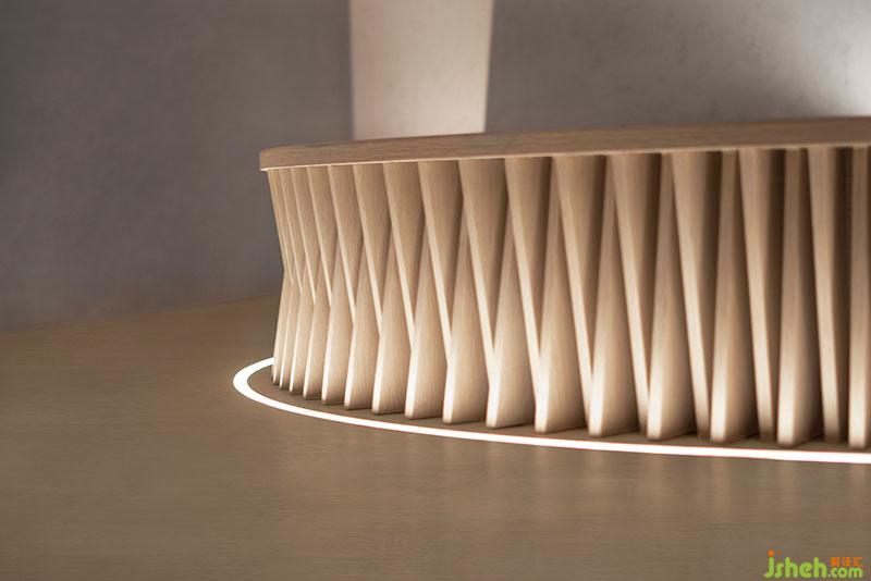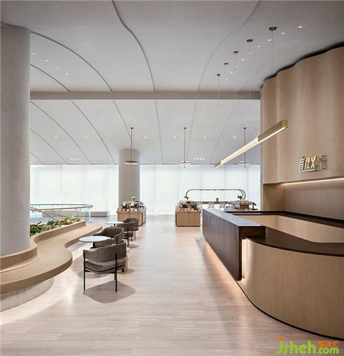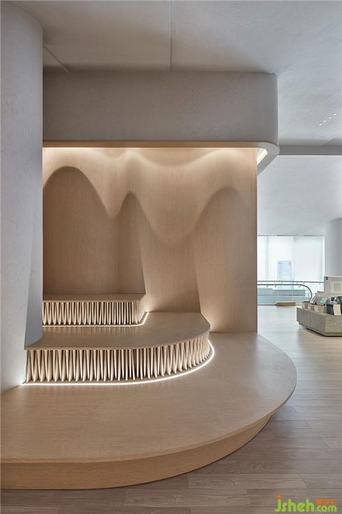 設(shè)計(jì)充分發(fā)揮空間層高優(yōu)勢,以挑空架構(gòu)為主,天花打造成山形走勢,疊加的曲面置入燈帶以打造自然光源的效果,狹長的落地窗、落入室內(nèi)的自然光成為空間體驗(yàn)亮點(diǎn)。