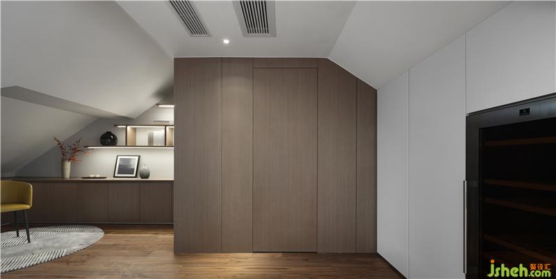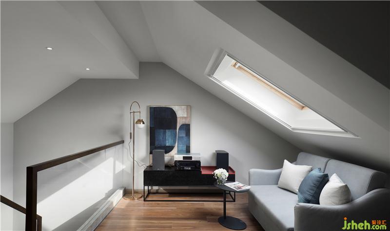 閣樓地面面積大,層高略低,維持原始斜屋頂,突出建筑之美,墻面發(fā)光層板補(bǔ)充光源不足。將自然舒適的材質(zhì)大量運(yùn)用裝飾中,淡雅節(jié)制,重視空間的舒適性和實(shí)際功能。達(dá)到室內(nèi)外的和諧統(tǒng)一。