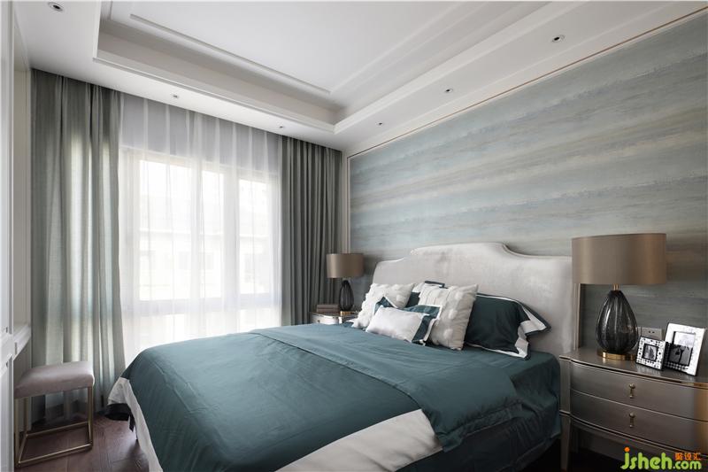 藍(lán)綠色的歐式次臥是為屋主90后的女兒特殊打造。純白柜體簡潔安寧,香檳粉妝凳,薄青色窗簾,啞金球形拉手,清新淡雅的色調(diào),小巧精致的軟裝,讓空間處處透露出優(yōu)雅。去往露臺的門扇也細(xì)心的處理成隱形與柜門形成整體。