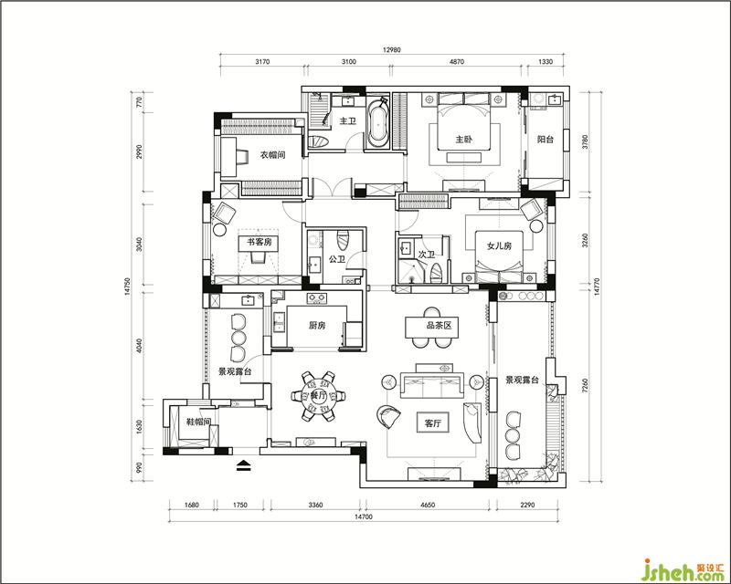 柔和的大地色系作為載體,大面積低飽和度綠色窗簾,鈷藍(lán)色抱枕以及跳躍緋紅色單位沙發(fā),饒有心機(jī)搭配的漸變地毯,一切都是如此的和諧,雅致之余,不失摩登感??筒蛷d均采用美克美家caracole系列,將傳統(tǒng)美式風(fēng)格與時(shí)尚相結(jié)合,“藝生活,亦摩登”。
