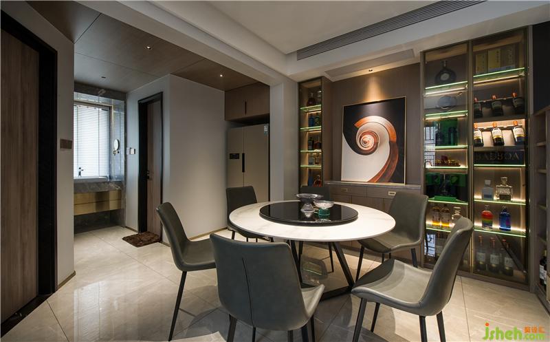 餐廳是家庭成員享用用美食的地方,同時也可用來開家庭會議。整個空間利用藝術(shù)涂料和灰色玻酒柜,以裝飾花瓶襯托,再加上極簡巖板現(xiàn)代餐桌組合,顯得空間十分完美和諧,更能增加主人翁的食欲。