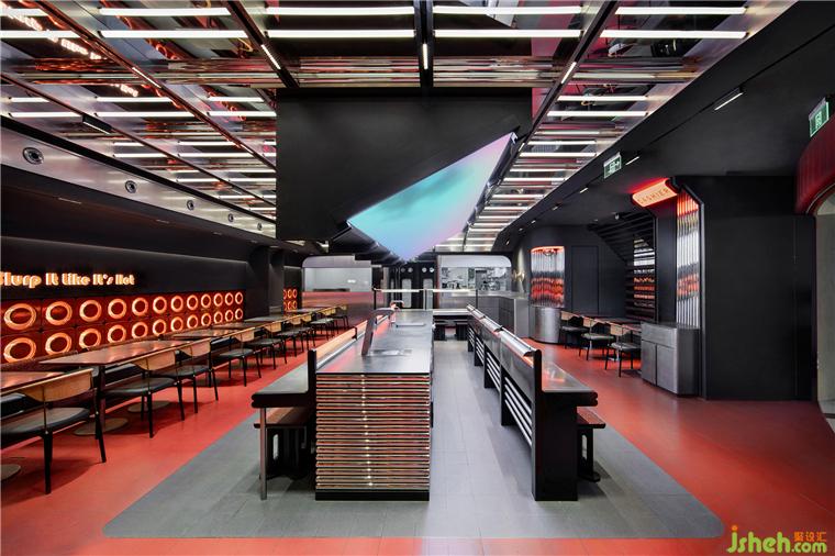 紅色從門頭蔓延至室內(nèi)墻面和地面,成為空間的主基調(diào)。杭州餐廳設(shè)計(jì)在沉穩(wěn)質(zhì)感的黑色映襯下,自內(nèi)而外散發(fā)出潮流、動(dòng)感的活力。一場感官激蕩下的嗦粉社交即將啟程。