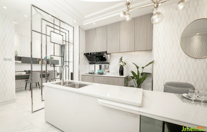 開放式空間設(shè)計,令書房、廚房、餐廳、客廳四區(qū)一體化,設(shè)計師靈活地利用空間布局,劃分各區(qū)的功能性作用,增加了儲物功能,使得空間看起來非常整潔干凈。而且整體米白色色調(diào)為鋪墊,金屬材質(zhì)點 綴,營造一種輕盈透亮的時尚感,不失個性,兼具品味與高貴。