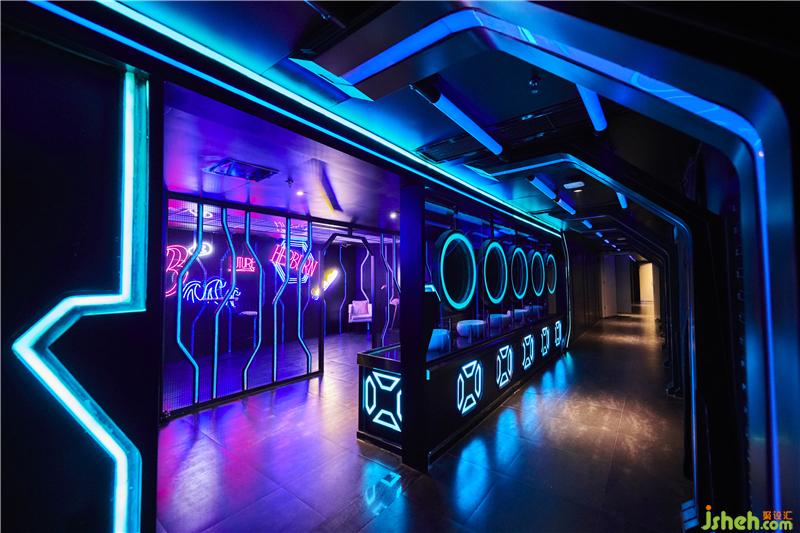 包廂區(qū)域設(shè)計(jì)師大面積地采用流行尖端的宇宙藍(lán)和太空白,運(yùn)用體塊疊加,與材料的有趣排列制造一種時(shí)空隧道的空間質(zhì)感,利用時(shí)間穿梭的設(shè)計(jì)概念、線條幾何圖形、環(huán)境燈光等設(shè)計(jì)元素將天花、墻面、地面有機(jī)結(jié)合,結(jié)合動(dòng)態(tài)光效,賦予空間極強(qiáng)的韻律感。