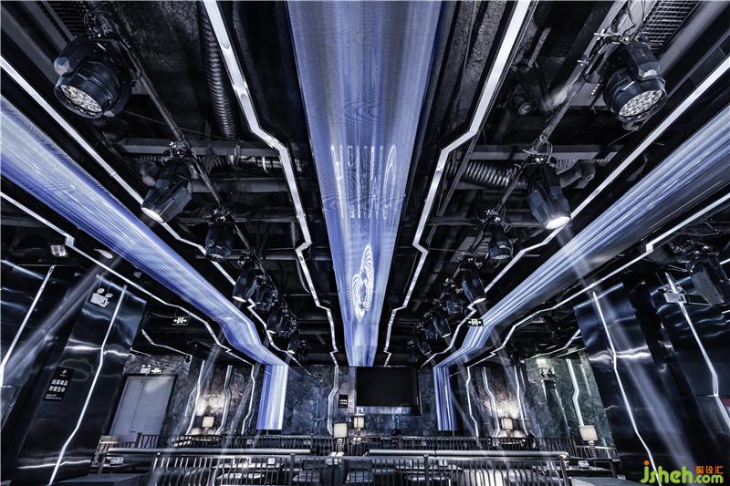 整體空間以中央舞臺以縱橫式展開,設(shè)計師運(yùn)用反向設(shè)計的技法,將LED屏反向設(shè)計至天花上,巧妙地規(guī)避了層高問題,同時增加空間景深感;在舞臺設(shè)計方面,條形LED屏與Madrix燈條形成呼應(yīng);運(yùn)用升降DJ臺、旋轉(zhuǎn)LED屏等方式,確保舞臺換場的流暢性。旋轉(zhuǎn)LED屏的背后燈陣設(shè)計,則更好地滿足樂隊(duì)、DJ秀等不同舞臺的燈光需求。多變的燈光與聲場搭配,提供給消費(fèi)者多變的舞臺場景體驗(yàn)。