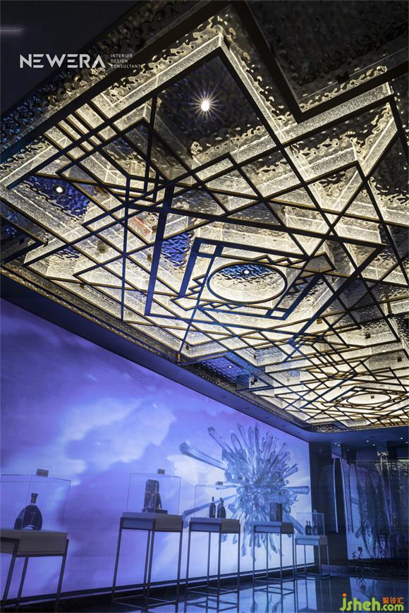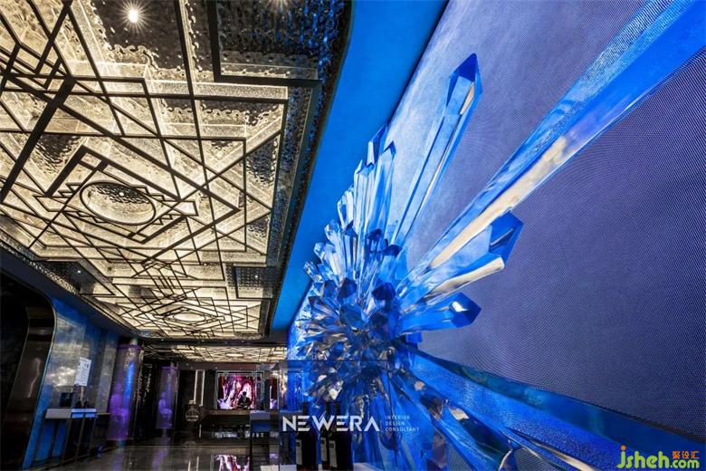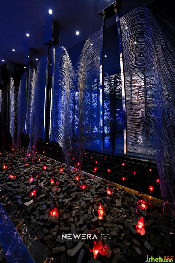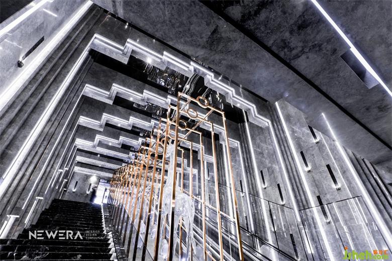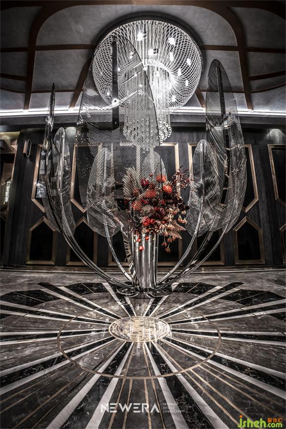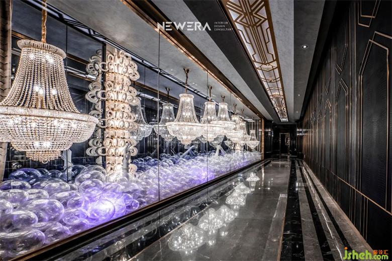 黑金色的空間色調(diào),從建筑外延伸至大廳,派對空間設(shè)計(jì)凸顯空間整體的神秘與藝術(shù)感。大廳中央大型水晶裝置,搭配機(jī)械金屬羽毛藝術(shù)裝置,強(qiáng)烈的線條裝飾性,使空間的造型充滿詩意和富于裝飾性。放射性的地面造型,基調(diào)以灰色調(diào)天然石材夾揉金屬不銹鋼材質(zhì),KTV設(shè)計(jì)師以對稱結(jié)構(gòu)強(qiáng)調(diào)了儀式感。