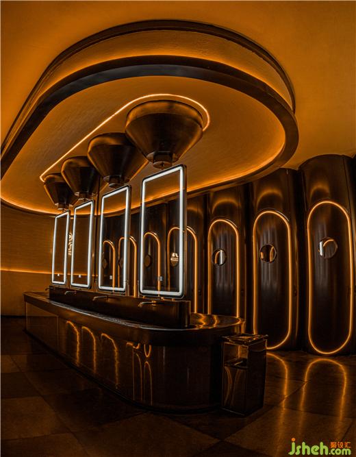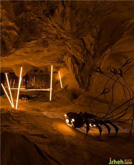 末日摧毀了現(xiàn)有的文明與秩序,卻又留存著文明殘影,這種近乎野蠻原始但又文明秩序的交織,酒吧設(shè)計(jì)連通了人類的過去與現(xiàn)在。甫一出場(chǎng)的沉浸式過道曲折迂回,藝術(shù)燈陣手法遁入時(shí)空隧道錯(cuò)覺,凝聚萬眾期待與好奇,由此叩開后啟示錄大門?;瘖y潮玩區(qū)夯土粗糲紋理傳達(dá)環(huán)保設(shè)計(jì)理念,序列鏡面引導(dǎo)視覺秩序與知覺延續(xù)。抽象未來主義的異形雕塑致敬經(jīng)典科幻IP,在多媒體快閃形態(tài)下將越夜越野的情緒無限渲染。