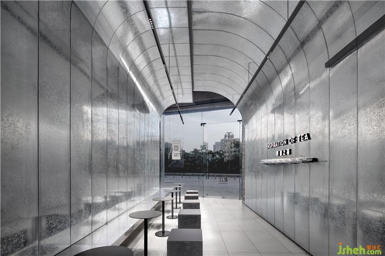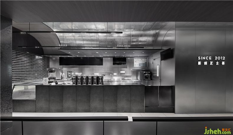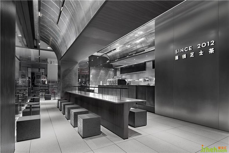 室內(nèi)部分,櫥窗頂部延續(xù)空間的設(shè)計(jì)元素形態(tài),喜茶設(shè)計(jì)運(yùn)用弧形視覺構(gòu)成入口正面與側(cè)面的不同構(gòu)成,墻面運(yùn)用深色防火板將展示LOGO簡潔展示,客區(qū)部分通過鋼板和火山巖結(jié)合的矮凳組合,與空間造型相互呼應(yīng),更加呼應(yīng)體現(xiàn)建筑感的元素理念。操作臺區(qū)域,墻面大面積的金屬反射與火山巖粗糙的外表形成互補(bǔ),室內(nèi)設(shè)計(jì)師巧妙地運(yùn)用干凈的不銹鋼與紋理豐富的鍍鋅板搭配,長條桌與墻體的穿插,體塊之間形成視覺上的延續(xù)效果與切割。