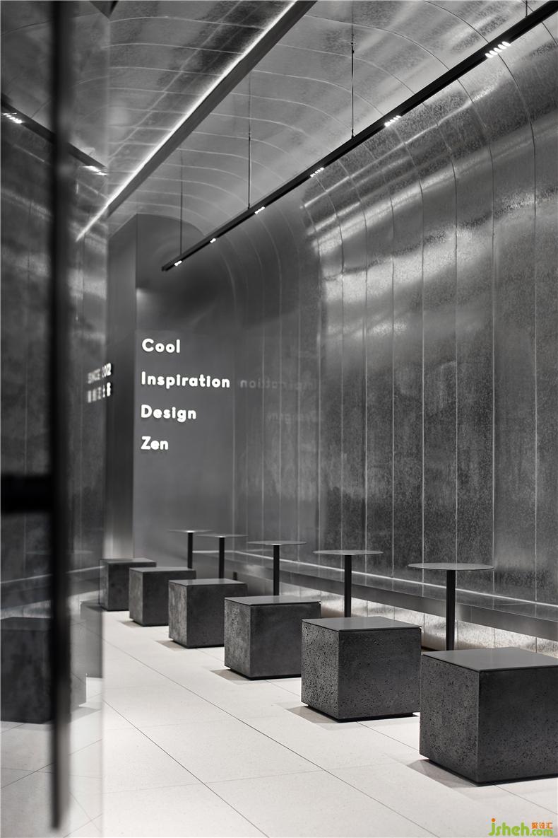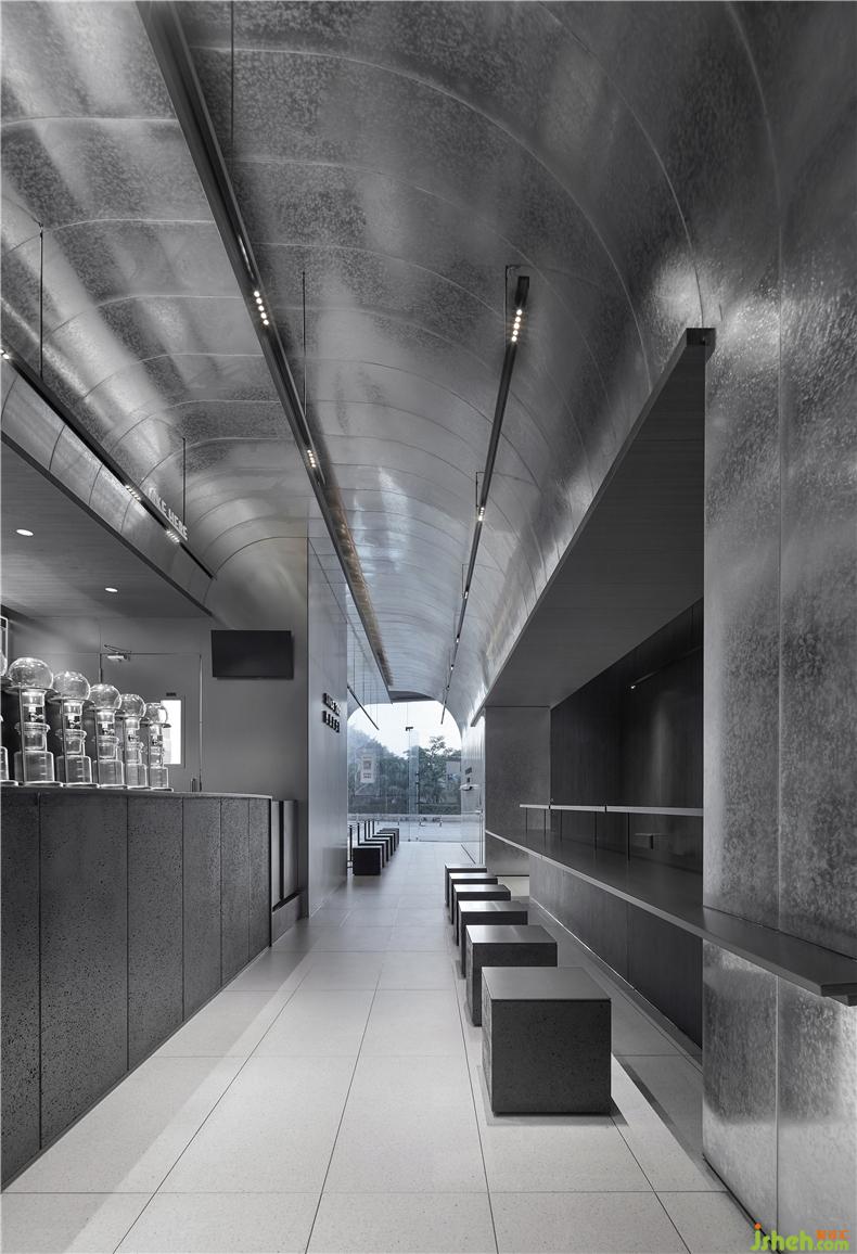 In the interior area , the design element form of the continuation space at the top of the window, uses curved vision to form the different front and side of the entrance. The dark fireproof board on the wall will display the simple display of LOGO, and the part of the passenger area is combined with the low stool combined with steel plate and volcanic rock. It echoes the spatial shape and echoes the elemental concept of architectural sense. In the operation area, the large-area metal reflection on the wall complements the rough appearance of the volcanic rock. The clean stainless steel is matched with the galvanized sheet with rich texture, and the long table and the wall are interspersed to form a visual relationship between the blocks. The continuation effect and cutting.