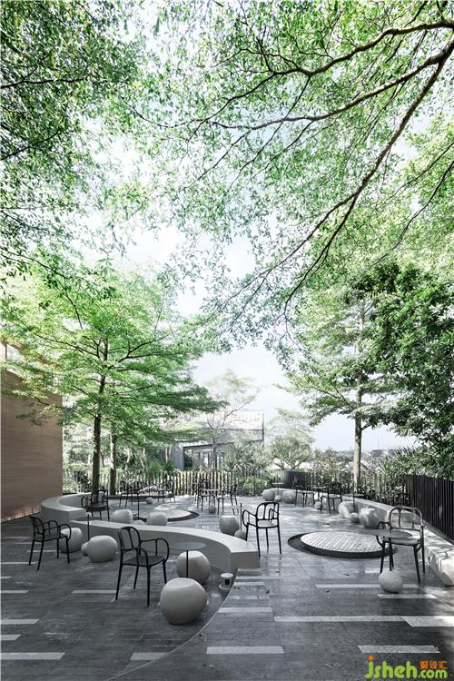 設(shè)計(jì)師帶著整體性的思維,以極簡(jiǎn)的手法營(yíng)造庭院景觀,造就了明朗和開(kāi)闊的貫穿格局,讓景與物的契合、人與人的互動(dòng)流暢而層次豐富。無(wú)論是呈45度角轉(zhuǎn)向序列布置的片狀格柵,下沉地形的座位布局,現(xiàn)代手法變形的筑山亭之景,還是或光滑、或粗糲、或迂形、或直線形的石凳流線,此間多重美學(xué)借景自然,寓物以形,有效激活庭院的觀賞美學(xué)與實(shí)用功能,更大程度上拓寬了社交場(chǎng)域的人流均衡度。